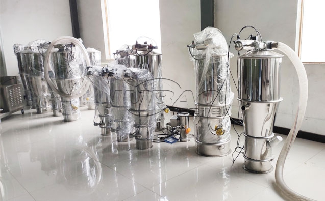 真空上料机的应用十分广泛,物料通过吸料管进入混合机内,在给混合机加料的过程中,将有少量的物料进入储料桶,可通过储料桶下的快开口回收物料。