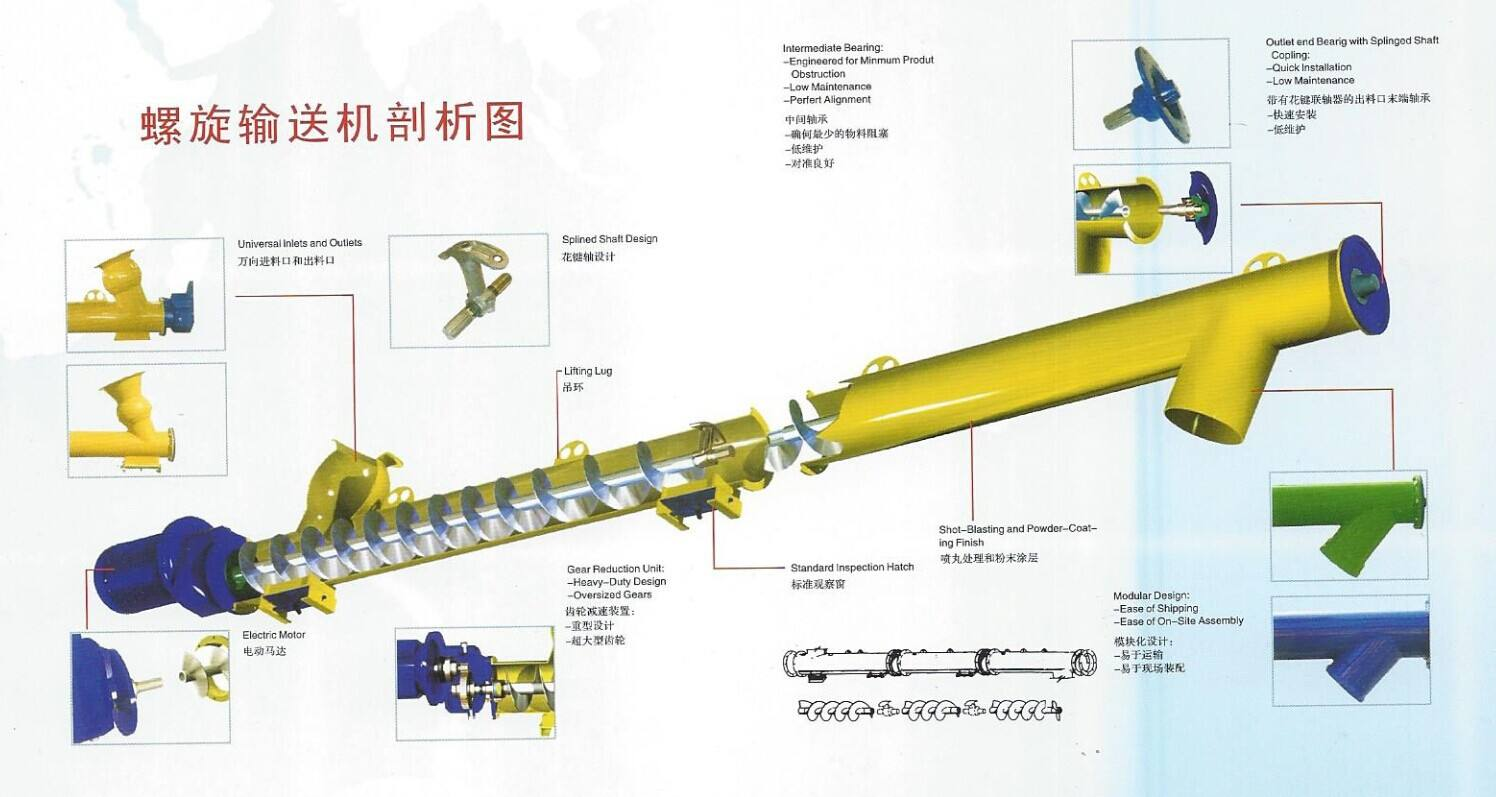 螺旋输送机是散装物料输送机,该螺旋线安装在管道内的轴上。它用于运输各种自由流动的物料,从食品到爆炸性粉尘。它也被称为螺旋输送机。使物料前进的螺旋叶片称为刮板。大部分安装在输送机出料端的驱动电机使螺旋叶片旋转。