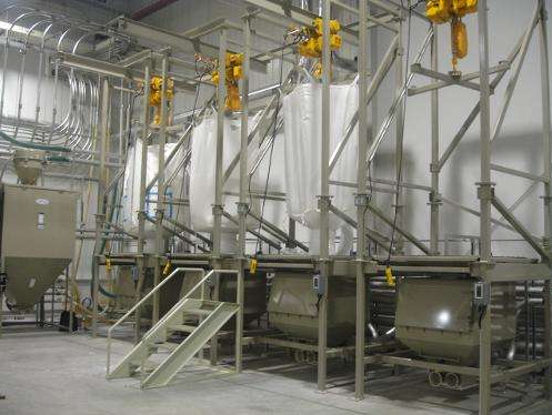 吨袋投料站可以很好的解决这个问题,吨袋投料站配置有专用的吨袋夹袋器装置,可以将吨袋袋口与设备下料通道很好的密封对接。吨袋密闭投料装置,吨袋的袋子是特制的,直接从供货商那边拿来就可以用的。吨袋四个角用电动葫芦拉起,袋子内衬2层袋子,下方中间有个出料口,扎2段绳子。首先将吨袋移至设备上方,设备上设有特制的接口,解开吨袋的第一段绳子,袋口与设备接口套住,然后夹紧,再解开第二段绳子,袋子里的物料就可以重力落入设备内。