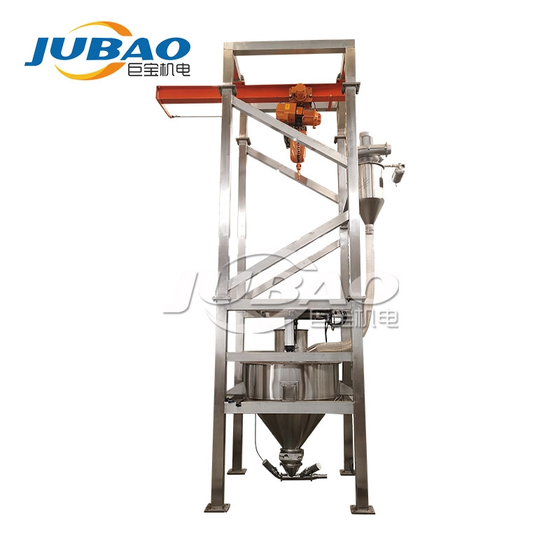 吨袋卸料投料站用于吨袋装粉状、颗粒状物料拆包卸料作业。该设备由机架、提升装置、隔膜阀、暂存料仓等组成;根据工艺特点和设备尺寸,可以采用吊机和叉车两种不同的方式; 可配有双轨道,用于两只电动葫芦安装的场合中,提高拆袋效率;材质分为碳钢和不锈钢两种;整套设备密封性好,操作简便,提高了生产环境和生产效率。