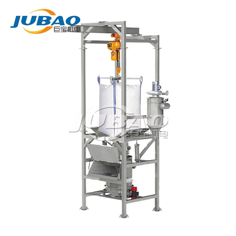 吨袋拆包机是将吨袋装物料经过电动葫芦将吨袋吊起,对应的固定支架以及称重架与传感器连接,将物料的重量信号传递给电器箱,由电控箱控制整台机器的运行。称重架上的升降气缸勾住包装袋角。外部信号及传感器的信号传递给电气箱,电气箱通过编制过的程序,控制加料电机的启动、停止、转速、气缸的升降。