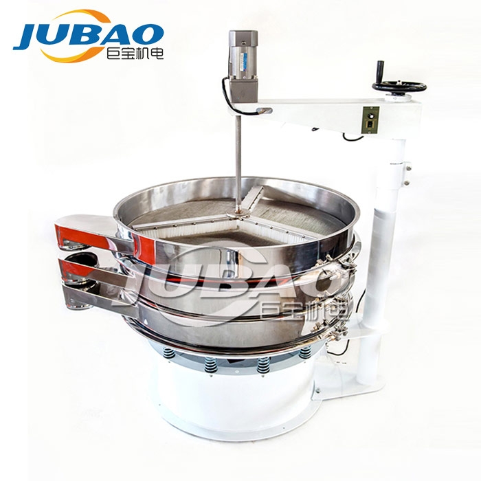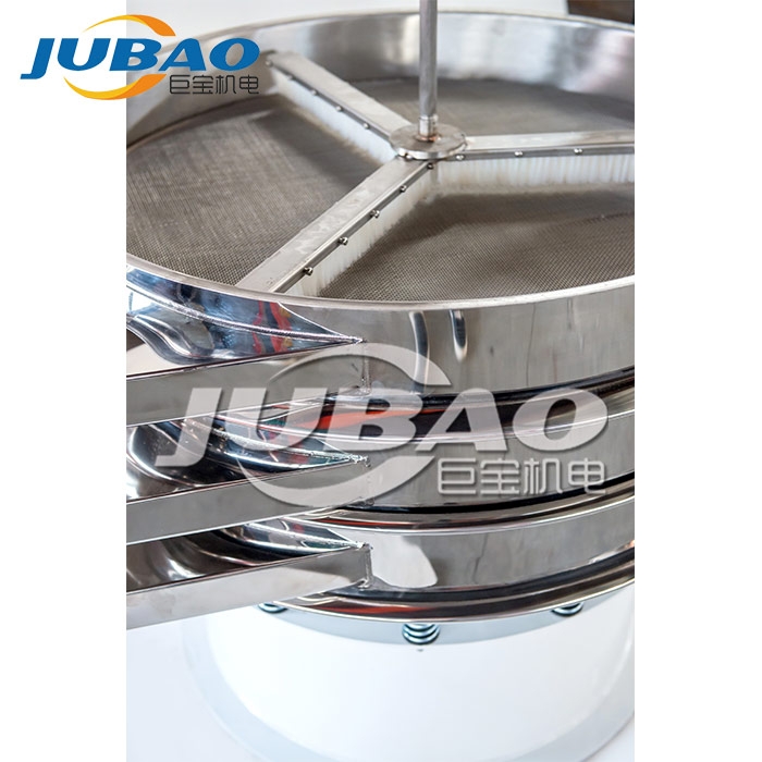 强力刮板振动筛是在圆形振动筛筛面上面新增不锈钢刮板或者毛刷,通过刮板或毛刷给物料一个外力 ,来加速物料通过筛网的筛分速度,来提高振动筛筛分量。还可以将结团物料打散、因静电吸附在筛网上面的物料刮离或者扫离筛面,因而把圆形振动筛的应用范围扩展至易起静电,易团球,易团聚的物料。例如在面粉筛分中,有些细渣子卡在网孔中,在刮板旋转推动的作用下,可以将杂质推向出料口,自动排出,减少了堵网的发生;在固液分离作业中,能把各类浆液中的非溶性物质迅速地清除从出料口排出,防止堵网,提高筛分效率。