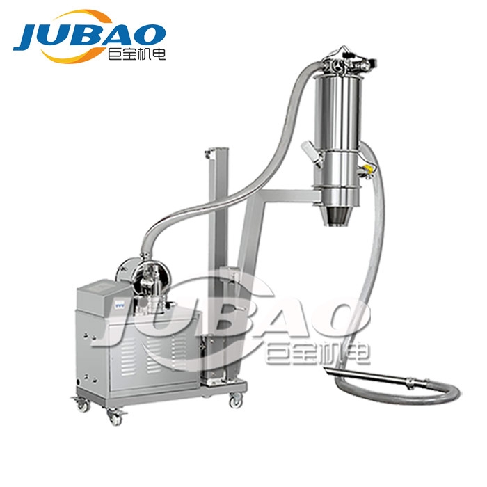 真空上料机中装有压缩空气反吹装置,每次放料时,压缩空气脉冲反吹过滤器,把吸附于过滤器表面的粉末打落下来,以保证吸料能正常运行。对有料位控制的真空上料机,受料设备的料斗中物料通过料位控制器完成自动加料。当受料设备的料斗高于某一位置时,真空上料机停止加料;当料位低于某一位置时,真空上料机自动启动,完成对受料设备的加料。